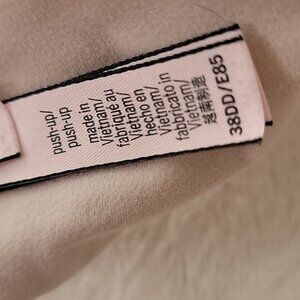 This is a cute Victoria's Secret beige padded underwire bra in a size 38DD. It is in nice condition with light wear to the outside. The inside cups have some wrinkles.