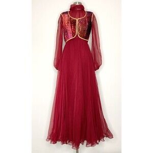 This is a vintage Lillie Rubin dress and vest set from the 1970s. The set includes a red long sleeve chiffon dress with a turtleneck collar. The size is small (S) and it is a regular size type. The brand is Lillie Rubin and the material is chiffon.