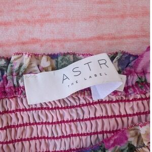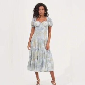 Romantic floral midi dress from ASTR The Label, perfect for adding a touch of whimsy to your wardrobe. This dress features a flattering sweetheart neckline with smocked detailing, short puff sleeves, and a tiered midi skirt. The all-over floral print in shades of pink, purple, and cream creates a soft and feminine look. The dress is lined and designed for a comfortable fit, making it ideal for day-to-night wear.
