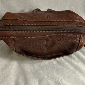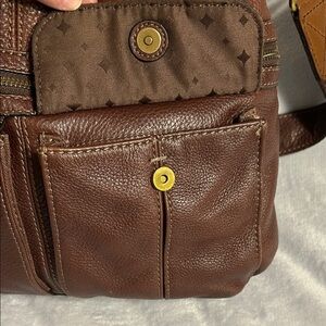 This gorgeous leather bag from the Fossil “Morgan Traveller” collection features plenty of room for your essentials. There are five exterior pockets and a roomy interior with a zippered pocket and 2 slip pockets. The bag is secured by a Fossil branded zipper with a leather zipper pull. The guitar strap is removable and adjustable. Measures approximately 13” across, 12” tall, with a 16-1/2” drop on the strap.