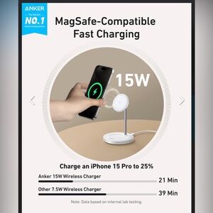 Anker charging stand. MagSafe design. Includes USB-C cable.