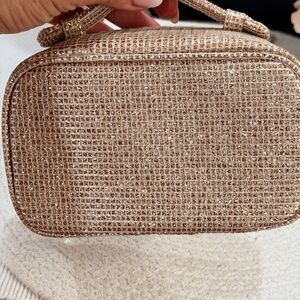 Chic Dior cosmetic case with a woven texture. Features a stylish gold hue and star charms. Ideal for organizing beauty essentials. Comes with a Dior Prestige card holder with metal mirror slide out and a Dior dust bag.