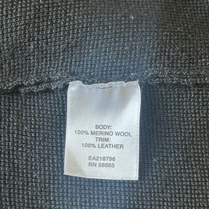 This Classiques Entier Atelier Merino Wool Leather Trim Knit Cardigan Sweater in Black is a Women’s Small. It measures approximately 18.5” pit to pit, 23” shoulder to hem, and 23.5” in the sleeves, and is in good condition.