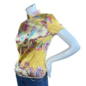 Y2K United Colors of Benetton Yellow Satin Floral Print Qipao Style Blouse Small