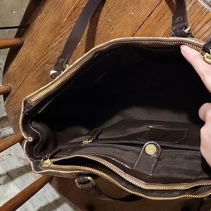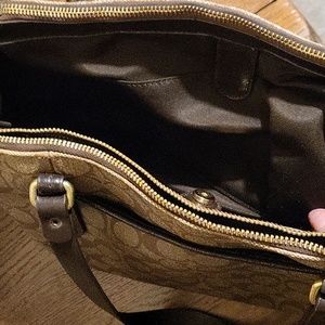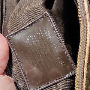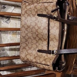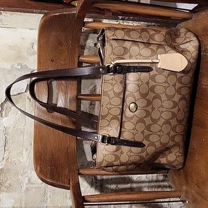Good condition gently used Coach handbag. Replacement genuine leather straps. Tons of pockets. Holds my small work laptop and iPad. fast shipping from a smoke free home. It measures roughly 9" in height, about 13 1/2" in length across the base and about 5 1/2" across the trim at the base.