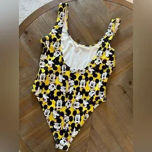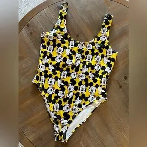 Disney Mickey Mouse yellow one piece swimsuit. Mickey with various expressions for a funny stylish look to be used as bikini or a top. Mickey himself loved it why wouldn’t you!?