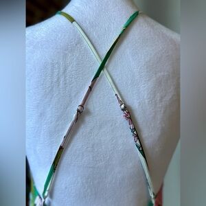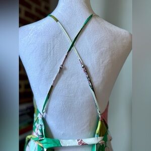 Lightweight woven fabric, with a '70s inspired floral print throughout, falls from adjustable spaghetti straps, shaping a faux-wrap dress with a surplice neckline and fitted bodice. High waist (with a removable sash belt) tops an overlapping mini skirt with a thigh-high side slit. Hidden zipper/clasp at back.
