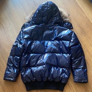 Moncler Kids Metallic Blue Puffer Winter Puffer Jacket with Fur Trim Size 5-7
