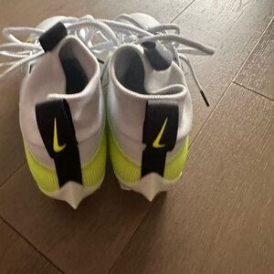 White and neon yellow football cleats with black accents. Sleek design for optimal performance.