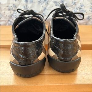 Elegant sneakers with a classic checkered design. Features black and tan hues.