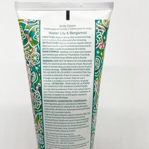Features: Hydrating body cream, Enriched with sunflower oil and aloe, 8 oz size, Scented with bergamot water lily and white musk, Made in the USA, Easy squeeze tube packaging