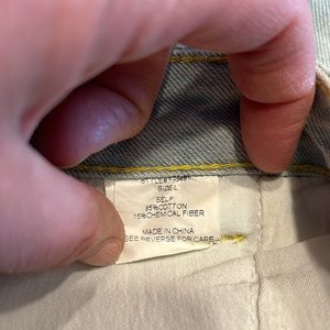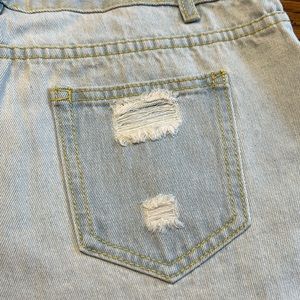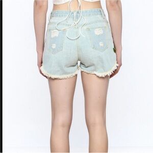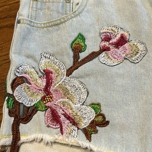 High rise jean shorts with embroidered flowers. 5 pocket design with distressing on back pockets and raw hem. Cotton blend. Button at waist with zipper fly. Belt loops. Super cute and excellent condition!