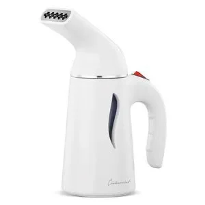 Sleek white handheld garment steamer with ergonomic handle. Ideal for quick and efficient wrinkle removal on the go or travel.