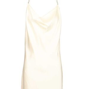 Long dress in silk blend with crystal shoulder straps and wide back.