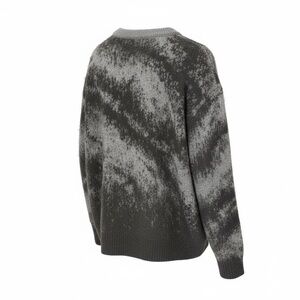 Chic and warm crew neck sweater. Features a stylish black and gray pattern. Ideal for versatile wear. Worn once. Relaxed fit. Round neck and ribbed trim.