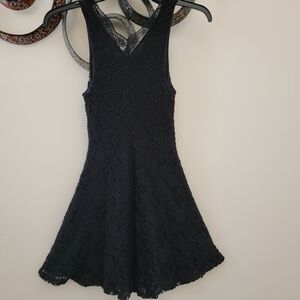 Chic black lace mini dress. Sleeveless with a flared skirt. Perfect for evenings out.