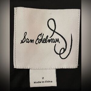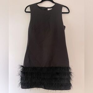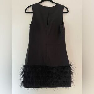 This stunning black mini dress by Sam Edelman features a sleeveless sheath design with a crew neck, perfect for cocktail parties. The dress is beautifully embellished with a playful feather trim at the hem, adding a touch of whimsy to its elegant silhouette.