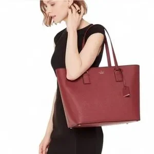 Elevate your everyday style with the Kate Spade New York Cameron Street Medium Harmony Tote Bag. Crafted from crosshatched leather with a chic brownstone hue, this tote is a versatile accessory that seamlessly transitions from work to weekend. Its generous size, featuring dimensions of 18.7 inches in width, 11.1 inches in height, and 6.4 inches in depth, provides ample space for your essentials. The Cameron Street Harmony Tote boasts a sophisticated gold hardware accent and a spade stud customization, adding a touch of elegance to the design. The double handles, wrapped in a complementary brownstone leather with lightly black trim, offer a comfortable grip. Inside, you'll find a bookstripe printed on poly twill lining, inner pockets for organization, and a zip top closure to securel your belongings with a 9-inch strap drop.