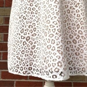 Flirty and feminine! Featuring slimming black panels of floral lace and swirl patterns. Calls attention to your trim waistline. Black and white lace, with a cream colored lining. Lightweight. Fully lined. Concealed rear zipper, and hook and eye closure.