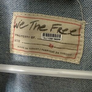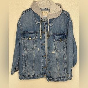 Casual blue jean jacket with button closures and gray hood. Features front pockets and a relaxed fit. Perfect for layering. Pre loved, no damage! Runs true to size but this is designed for an oversized look.