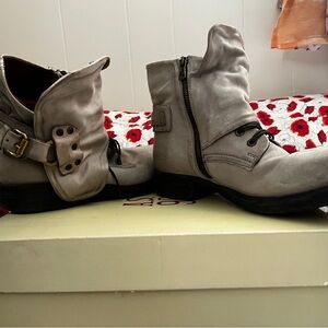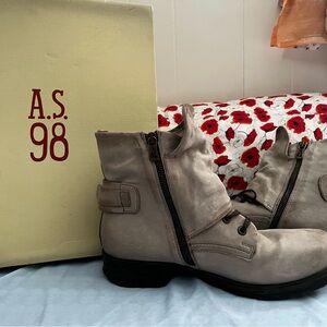 Stylish distressed cream ankle boots by A.S.98. Features a side zipper and buckle detail. Perfect for versatile wear. Worn once for a couple of hours.