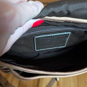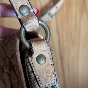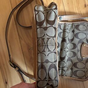 crossbody with signature pattern. Features brown and tan hues. Ideal for daily wear. Heavily work with scratches, rubbed/frayed fabric and darkening/ staining throughout. Price reflects wear. Still lots of life left and could be a great every day cross body bag.