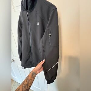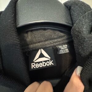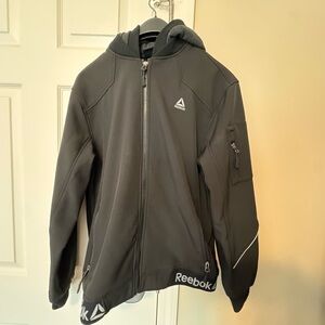 Charcoal Reebok jacket with logo accents. Features a sleeve pocket and drawstring hood.