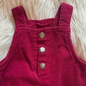 Stylish red corduroy pinafore dress with button details. Features front pockets for added charm. Worn once. Like new.