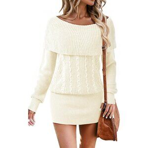 Women's White Long Sleeve Cowl Neck Bodycon Mini Sweater Short Dress