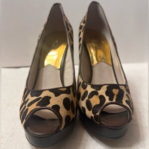 Stylish animal print design. Peep toe with high stiletto heel. Ideal for a bold look. Please check the last picture for some details of scratches on insole heel.