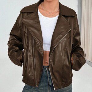 Coffee Brown Casual Women's Faux Leather Biker Jacket