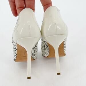 These Manolo Blahnik pumps are crafted in crisp white patent leather with intricate laser cut-out floral detailing. The pointed toe silhouette enhances the delicate design, offering a refined and feminine finish ideal for springtime occasions or bridal styling.