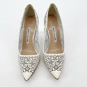 Manolo Blahnik White Leather Laser Cut Bb 105 Floral Pointed Toe Pump IT 38.5