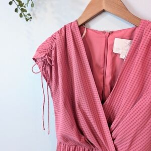 This stunning pink sundress by Gal Meets Glam features a flattering wrap-style V-neckline and short sleeves. The pleated skirt adds a touch of elegance, making it perfect for a wedding guest or cocktail occasion. Its light, flowy fabric ensures comfort and style throughout the day. no flaws. never worn. measurements in photos.