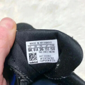 One sneaker does have the tiniest bit of peeling on the blue line of the Adidas graphic on the side (see photo). In otherwise great, used condition.