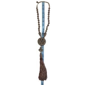 The box, designers' card, and warranty all included. Circular pendant has a crystal covered dragon inside. The brown silk tassel hangs approx. 5" long.