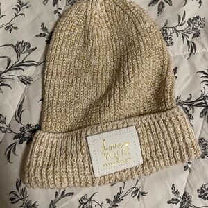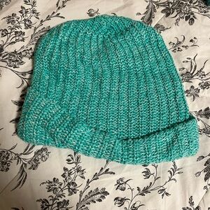 Adorable beanie trio. Includes aqua, cream, and tan colors. Perfect for warmth and style.