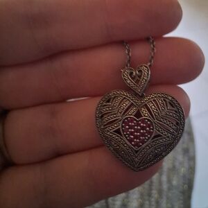 Elegant necklace featuring a heart-shaped pendant with intricate detailing. The pendant is silver with a touch of red stones in the center.