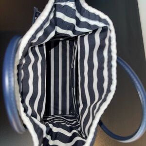 Navy blue Kate Spade bag with drawstring navy blue and white striped lining. Has a detachable crossbody strap.