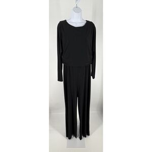 This DKNY jumpsuit is a sleek, minimalist piece crafted in solid black with a modern, elegant silhouette. It features a relaxed, draped bodice with a wide scoop neckline and long sleeves, giving it a polished yet comfortable feel. The waistline is defined subtly before flowing into wide-leg pants that create a lengthening, fluid look. Made from a soft, lightweight fabric with stretch, it offers both ease of movement and a flattering fit. This versatile design can easily transition from day to night, making it perfect for both professional settings and evening occasions.