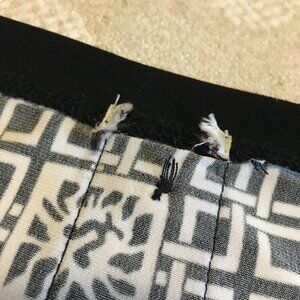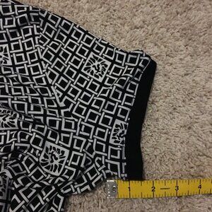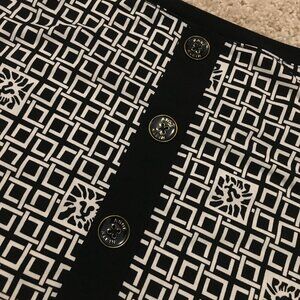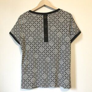 Good preowned condition, stretchy, white short sleeve top with thick black cuffs, collar and faux buttons on the back. A lion head tile and square weave pattern tie it seamlessly together. Super duper cute. Love it.