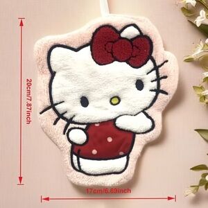 Adorable Hello Kitty hanging towel with red polka dot dress. Perfect for adding a cute touch to your bathroom decor.