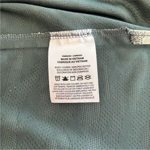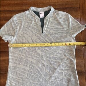The Nike Dri-Fit Golf Shirt for women in size medium is a stylish and functional piece of activewear perfect for golfing or other summer activities. Made from 100% polyester with a lightweight and breathable jacquard fabric, this shirt features a V-neckline, short sleeves, and a pullover closure. The light green color with a geometric pattern adds a feminine touch, while the athletic fit and Nike branding ensure performance and quality. Machine washable and designed specifically for golf, this shirt is a great addition to any active woman's wardrobe.