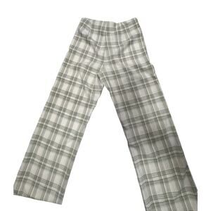West of Melrose plaid pants in an off-white base with delicate sage green check accents, designed with a high-rise waist, straight-leg silhouette, and softly tailored structure. These trousers feature a smooth woven fabric with light stretch that offers comfort while maintaining a clean, polished drape. The subtle plaid pattern and neutral palette make them ideal for quiet luxury, academia, coastal grandmother, French girl, capsule wardrobe, soft autumn, minimalist, and retro tailoring aesthetics.