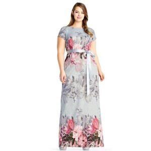 Adrianna Papell women’s plus-size gown, size 16W. Features a stunning floral matelassé jacquard design with shimmering metallic threads in shades of gray, silver, and pink. Elegant short sleeves, round neckline, and detachable satin waist tie belt. Fully lined for comfort and a polished fit.