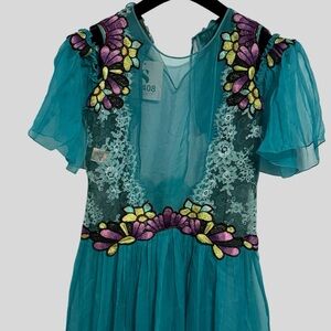 Absolutely stunning Alberta Ferretti unlined teal chiffon and lace dress with bold multicolor floral embroidery. Romantic, feminine, and beautifully detailed — the perfect special-occasion or statement piece.