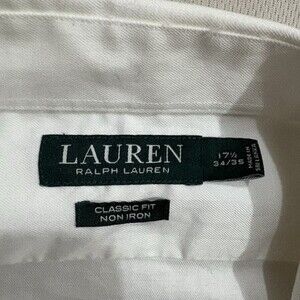 Lauren Ralph Lauren Classic Fit White Dress Shirt – Non-Iron, 17.5 / 34–35 Elevate your wardrobe with this Lauren Ralph Lauren Classic Fit dress shirt in timeless white. Crafted from 100% cotton, this shirt features a non-iron finish for easy care and a polished look all day long. Perfect for business, formal occasions, or everyday professional wear. Good pre-owned condition. No holes or major flaws. Please review photos for exact condition and measurements. Feel free to ask.