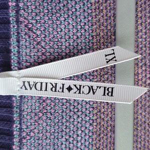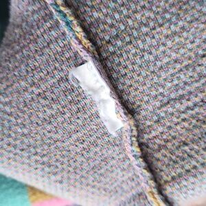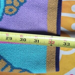 Purple, pink, blue, and yellow moths on this thick knit, long, open intarsia sweater.