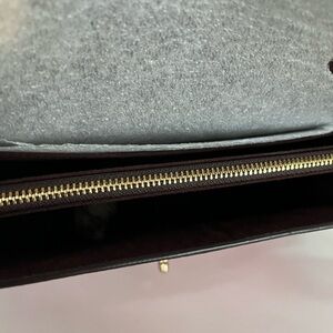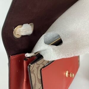 Signature Coach coated canvas and smooth leather. Inside multifunction pocket. Center zip compartment. Gold hardware. Turn lock closure, fabric lining. Outside open pocket