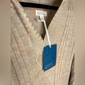 Adorable Market & Spruce “Afon” Cable Knit Hooded Sweater in ladies size 3X. It’s a tunic length, cable knit in light blue and muted orange (reads like tan). It’s 55% cotton, 40% nylon and 5% acrylic. Machine wash in cold water and lay flat to dry. Pretty vertical cable knit pattern with ribbed cuffs, hem and trim around the hoodie. MSRP $64. The pit-to-pit measurement is 25” (without stretching), the length is 32” and the sleeves are 27” (including 3” cuff). It’s a lightweight sweater that’s so cute and NWT!